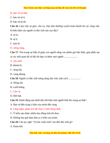 Câu 17. Tôn trọng sự thật sẽ giúp con người nâng cao phẩm giá bản thân, góp phần tạo