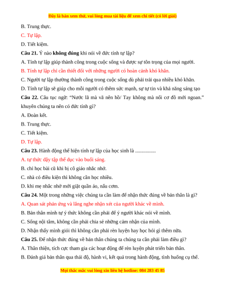 Câu 23. Hành động thể hiện tính tự lập của học sinh là ................