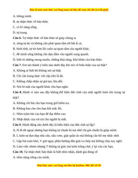 Câu 10. Tự nhận thức bản thân là biết nhìn nhận, đánh giá đúng về