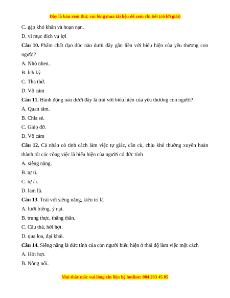 Câu 10. Phẩm chất đạo đức nào dưới đây gắn liền với biểu hiện của yêu thương con