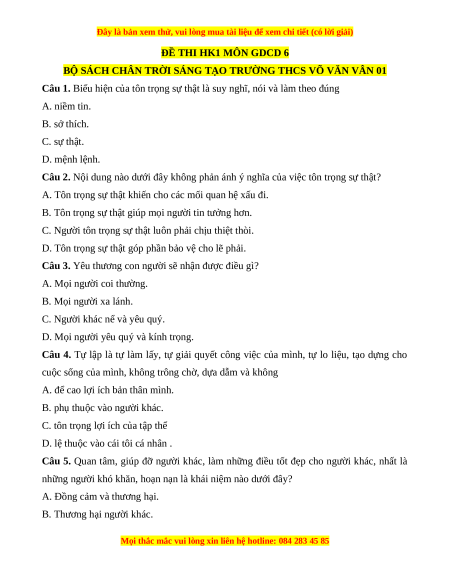 Đề thi GDCD 6 cuối kì 1 THCS Võ Văn Vân - Đề 3 có đáp án