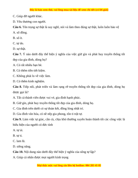 Câu 10. Nội dung nào dưới đây thể hiện ý nghĩa của sống tự lập?