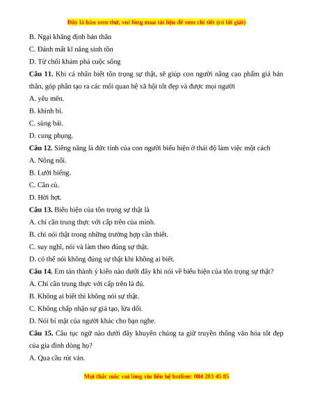 Câu 11. Khi cá nhân biết tôn trọng sự thật, sẽ giúp con người nâng cao phẩm giá bản