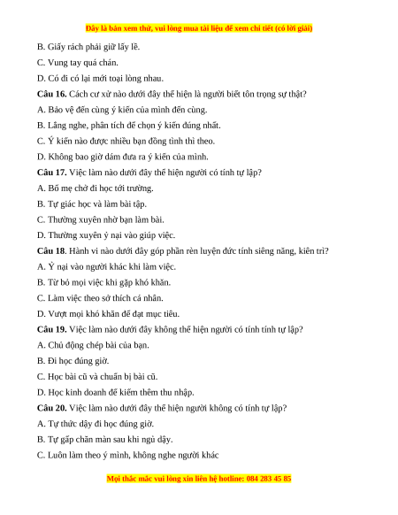 Câu 20. Việc làm nào dưới đây thể hiện người không có tính tự lập?