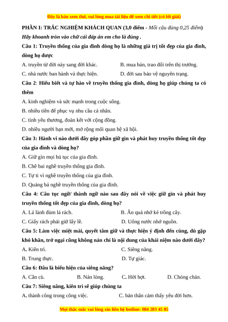 Câu 1: Truyền thống của gia đình dòng họ là những giá trị tốt đẹp của gia đình,