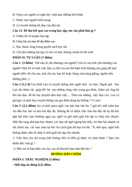Câu 1: (3 điểm) Thế nào là yêu thương con người? Giá trị của tình yêu thương con