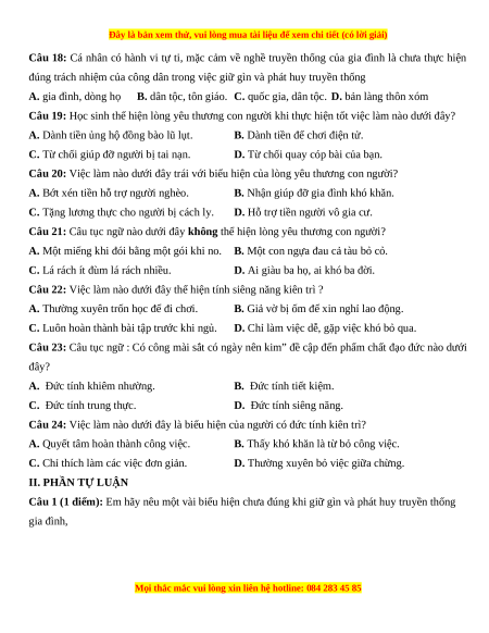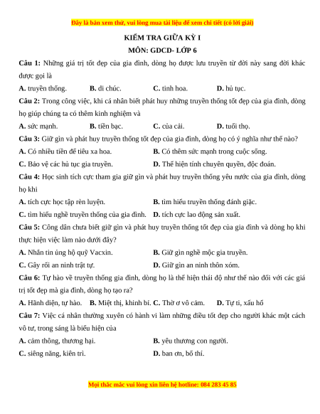 Câu 1: Những giá trị tốt đẹp của gia đình, dòng họ được lưu truyền từ đời này sang đời khác được gọi là A. truyền thống. B. di chúc. C. tinh hoa. D. hủ tục.