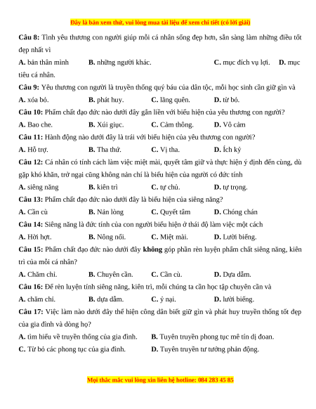 Câu 10: Phẩm chất đạo đức nào dưới đây gắn liền với biểu hiện của yêu thương con người? A. Bao che. B. Xúi giục. C. Cảm thông. D. Vô cảm
