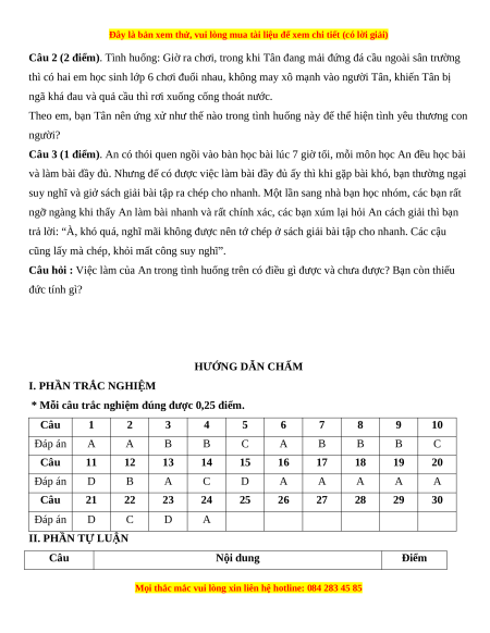 Câu hỏi : Việc làm của An trong tình huống trên có điều gì được và chưa được? Bạn còn thiếu đức tính gì? HƯỚNG DẪN CHẤM