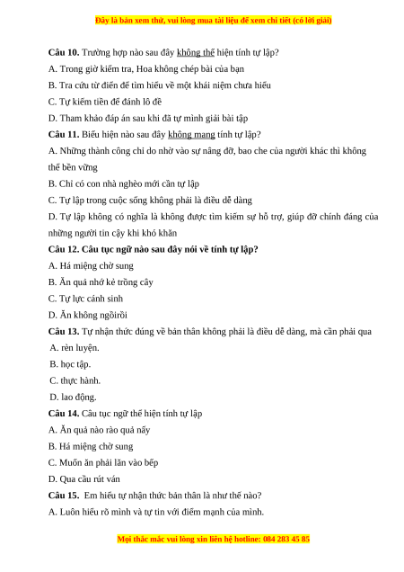 Câu 10. Trường hợp nào sau đây không thể hiện tính tự lập?