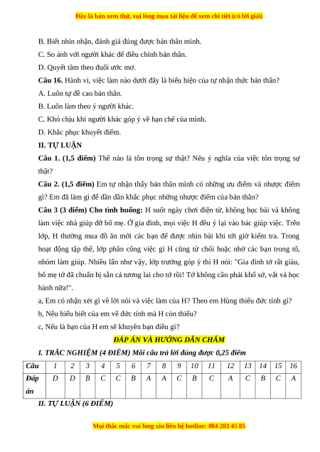 Câu 16. Hành vi, việc làm nào dưới đây là biểu hiện của tự nhận thức bản thân?