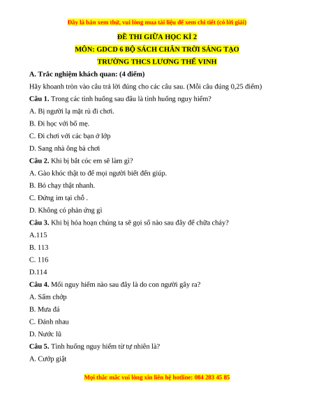 Đề thi GDCD 6 giữa kì 2 THCS Lương Thế Vinh - Đề 2 có đáp án