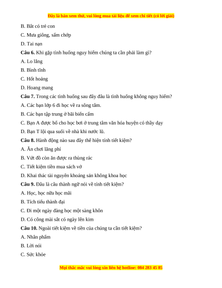 Câu 6. Khi gặp tình huống nguy hiểm chúng ta cần phải làm gì? A. Lo lắng B. Bình tĩnh C. Hốt hoảng D. Hoang mang