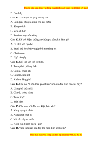 Câu 10. Ngoài tiết kiệm về tiền của chúng ta cần tiết kiệm? A. Nhân phẩm B. Lời nói C. Sức khỏe