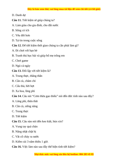 Câu 16. Việc làm nào sau đây thể hiện tính tiết kiệm?