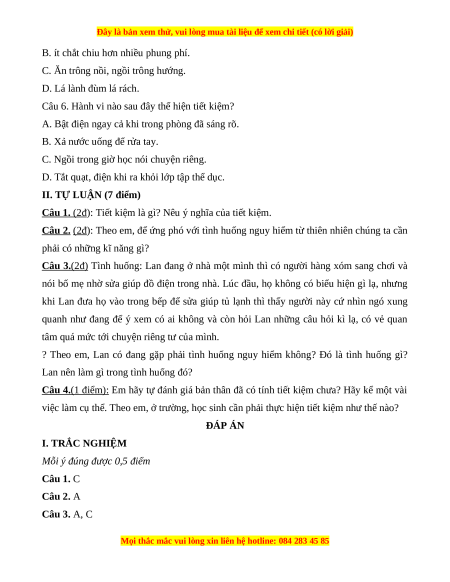 việc làm cụ thể. Theo em, ở trường, học sinh cần phải thực hiện tiết kiệm như thế nào? ĐÁP ÁN I. TRẮC NGHIỆM
