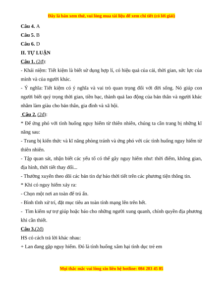Câu 4. A Câu 5. B Câu 6. D II. TỰ LUẬN Câu 1. (2đ ):