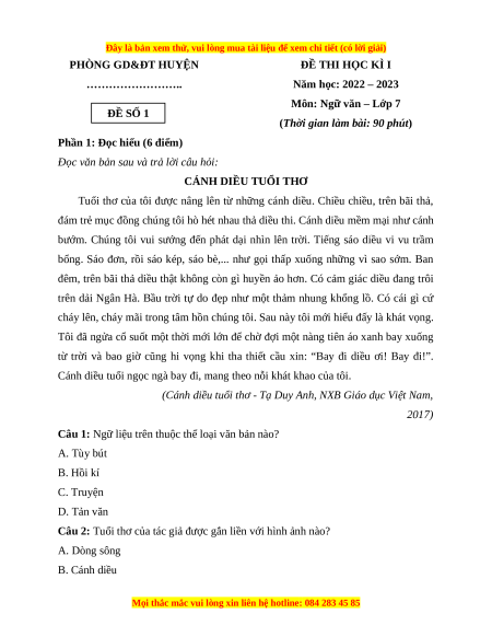 Phần 1: Đọc hiểu (6 điểm) Câu Đáp án Điểm Câu 1 D. Tản văn 0,5 điểm Câu 2 B. Cánh diều 0,5 điểm