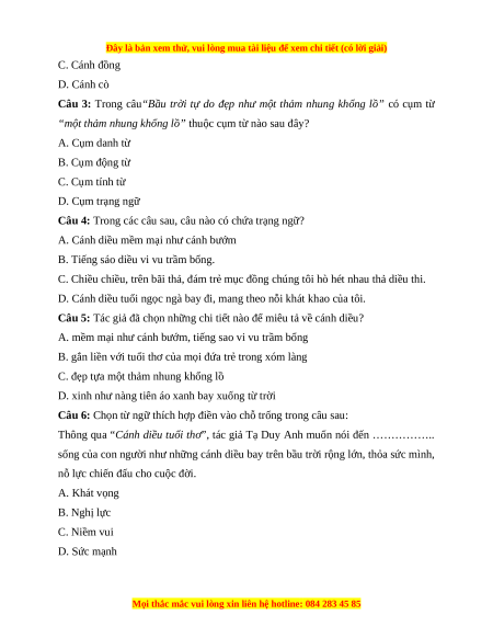 Câu 5 A. mềm mại như cánh bướm, tiếng sáo vi vu trầm bổng 0,5 điểm Câu 6 A. Khát vọng 0,5 điểm