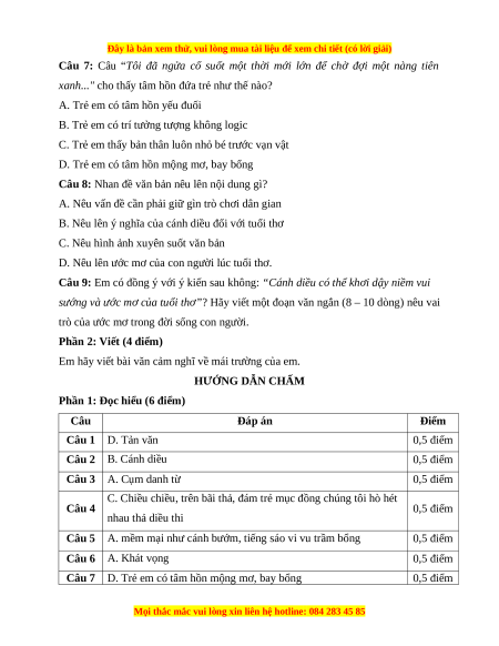 Câu 7 D. Trẻ em có tâm hồn mộng mơ, bay bổng 0,5 điểm