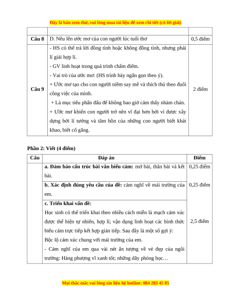 Câu 8 D. Nêu lên ước mơ của con người lúc tuổi thơ 0,5 điểm