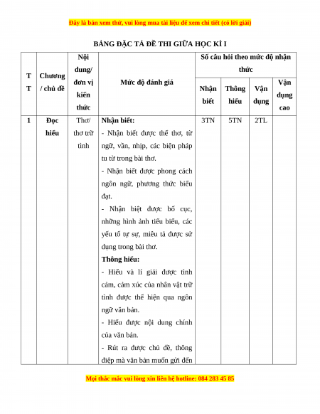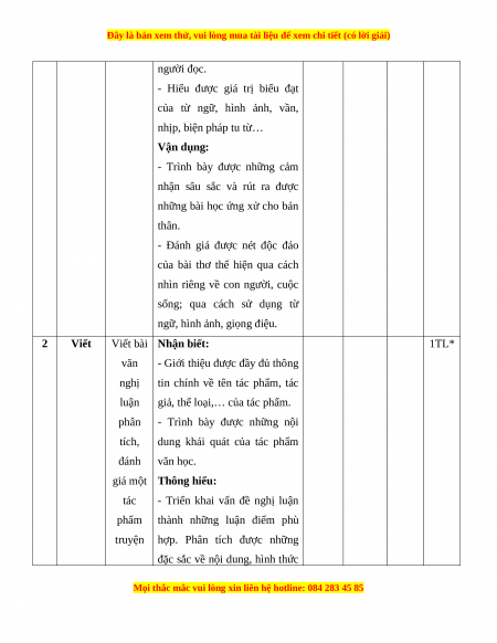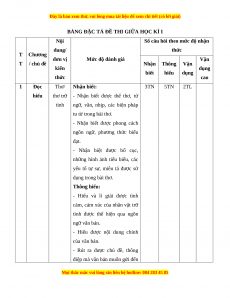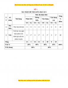 Mức độ nhận thức Tổng T Kĩ Thông Vận dụng Nội dung Nhận biết Vận dụng % T năng hiểu cao điểm TN TL TN TL TN TL TN TL Đọc 1 Thơ/ thơ trữ tình 3 0 5 0 0 2 0 0 60 hiểu Viết bài văn nghị luận phân tích, 2 Viết 0 1* 0 1* 0 1* 0 1* 40 đánh giá một tác phẩm truyện Tổng 15 5 25 15 0 30 0 10 Tỉ lệ % 20% 40% 30% 10% 100% Tỉ lệ chung 60% 40%