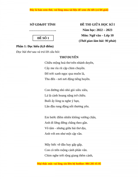 Môn: Ngữ văn – Lớp 10 ĐỀ SỐ 1