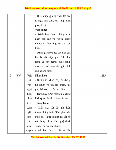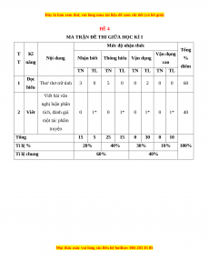 Thông hiểu Vận dụng % T năng cao điểm TN TL TN TL TN TL TN TL Đọc 1 Thơ/ thơ trữ tình 3 0 5 0 0 2 0 0 60 hiểu Viết bài văn nghị luận phân 2 Viết tích, đánh giá 0 1* 0 1* 0 1* 0 1* 40 một tác phẩm truyện Tổng 15 5 25 15 0 30 0 10 Tỉ lệ % 20% 40% 30% 10% 100% Tỉ lệ chung 60% 40%