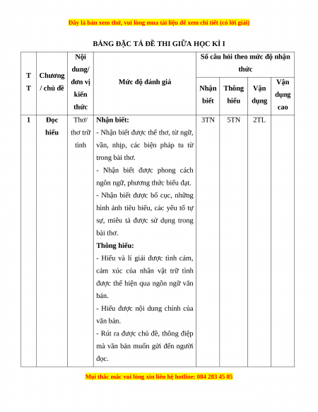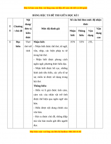 Số câu hỏi theo mức độ nhận dung/ thức T Chương đơn vị Mức độ đánh giá Vận T / chủ đề Nhận Thông Vận kiến dụng biết hiểu dụng thức cao 1 Đọc Thơ/ Nhận biết: 3TN 5TN 2TL hiểu