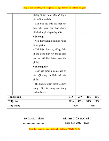 trong bài viết; sáng tạo trong cách diễn đạt. Tổng số câu 3TN 5TN 2TL 1TL Tỉ lệ (%) 20% 40% 30% 10% Tỉ lệ chung 60% 40% SỞ GD&ĐT TỈNH