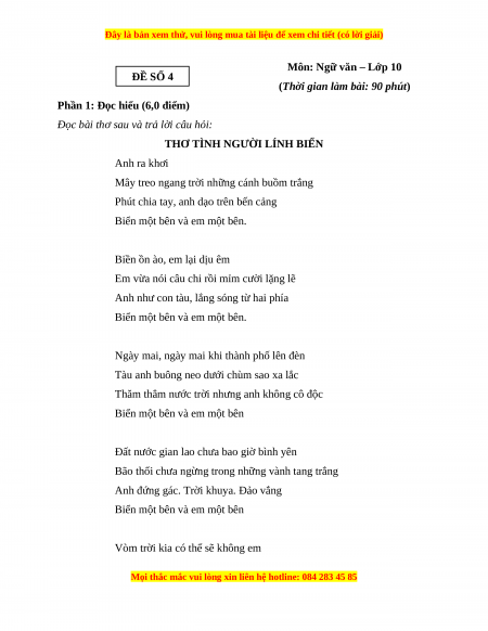 Môn: Ngữ văn – Lớp 10 ĐỀ SỐ 4