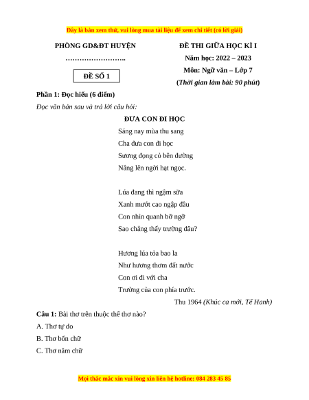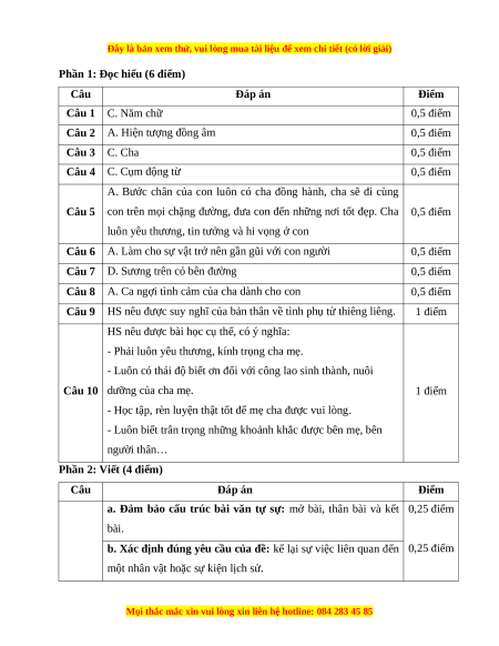 Phần 1: Đọc hiểu (6 điểm) Câu Đáp án Điểm Câu 1 C. Năm chữ 0,5 điểm