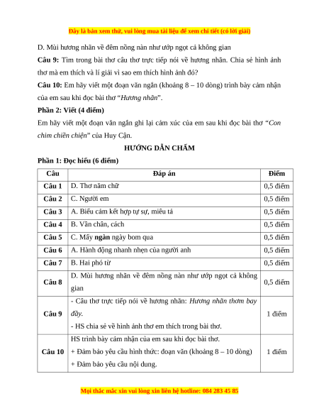 Phần 1: Đọc hiểu (6 điểm) Câu Đáp án Điểm Câu 1 D. Thơ năm chữ 0,5 điểm Câu 2 C. Người em 0,5 điểm Câu 3