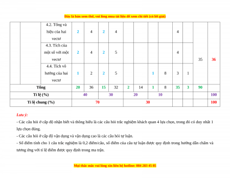 4.2. Tổng và hiệu của hai 2 4 2 4 4 vectơ 4.3. Tích của một số với một 2 4 2 5 4 vectơ 35 36 4.4. Tích vô hướng của hai 1 2 2 5 1 8 3 1 vectơ Tổng 20 36 15 32 2 14 1 8 35 3 90 Tỉ lệ (%) 40 30 20 10 100 Tỉ lệ chung (%) 70 30 100 Lưu ý: