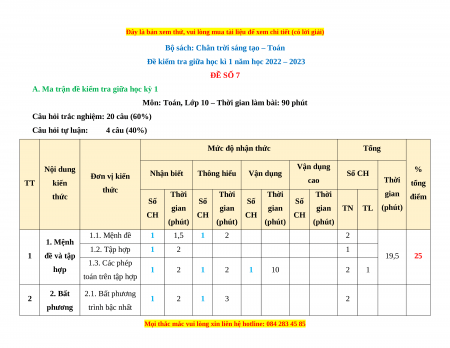Đề kiểm tra giữa học kì 1 năm học 2022 – 2023 ĐỀ SỐ 7