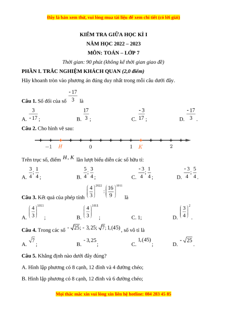 NĂM HỌC 2022 – 2023 MÔN: TOÁN – LỚP 7