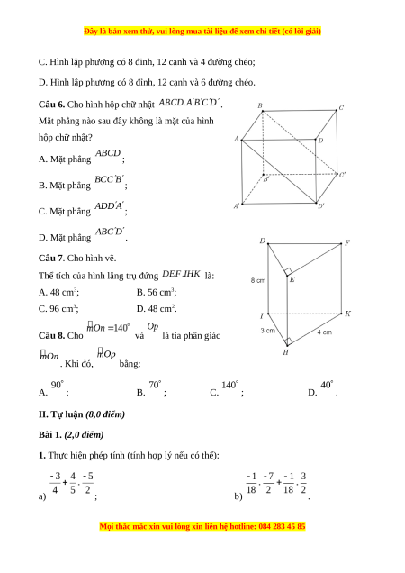 Thể tích của hình lăng trụ đứng là: A. 48 cm3; B. 56 cm3; C. 96 cm3; D. 48 cm2. Câu 8. Cho và là tia phân giác . Khi đó, bằng: A. ; B. ; C. ; D. .