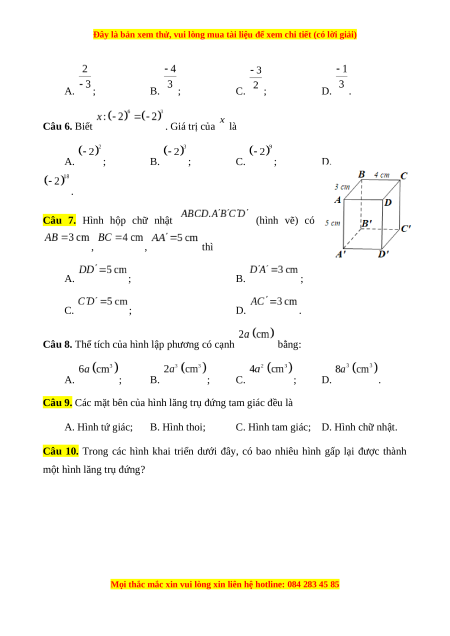 Câu 8. Thể tích của hình lập phương có cạnh bằng: A. ; B. ; C. ; D. .