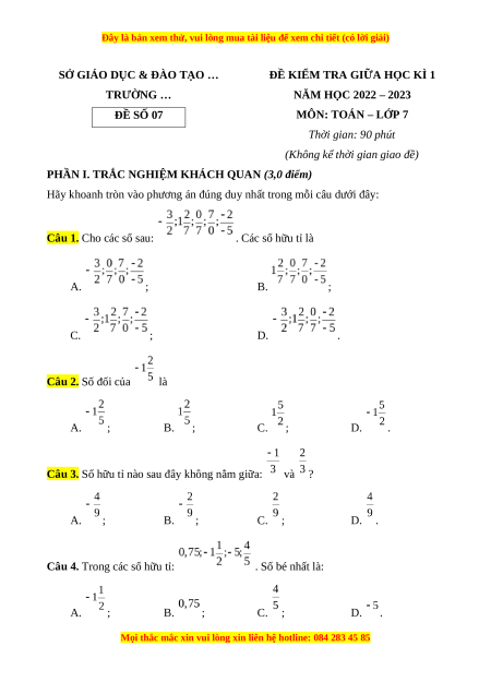 NĂM HỌC 2022 – 2023 ĐỀ SỐ 07 MÔN: TOÁN – LỚP 7 Thời gian: 90 phút