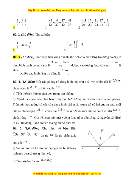Bài 4. (1,5 điểm) Một căn phòng có dạng hình hộp chữ nhật với chiều dài là , chiều rộng là , chiều cao là .