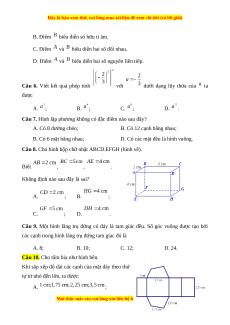 Câu 7. Hình lập phương không có đặc điểm nào sau đây? A. Có 8 đường chéo; B. Có 12 cạnh bằng nhau; B. Có 6 mặt bằng nhau;