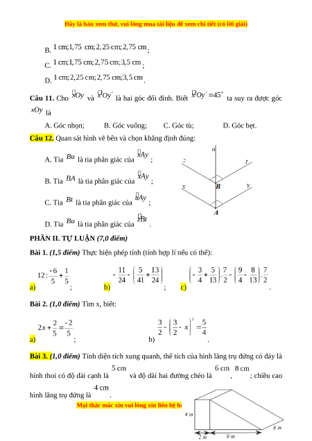 Bài 3. (1,0 điểm) Tính diện tích xung quanh, thể tích của hình lăng trụ đứng có đáy là