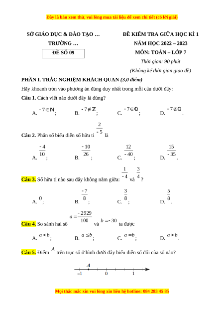 NĂM HỌC 2022 – 2023 ĐỀ SỐ 09 MÔN: TOÁN – LỚP 7 Thời gian: 90 phút