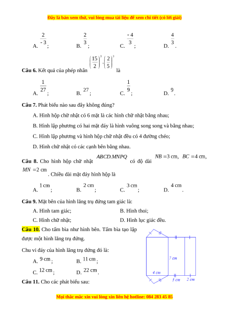 Câu 9. Mặt bên của hình lăng trụ đứng tam giác là: A. Hình tam giác; B. Hình thoi; C. Hình chữ nhật; D. Hình lục giác đều.