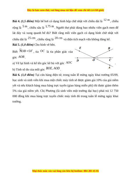 Bài 4. (1,5 điểm) Một bể bơi có dạng hình hộp chữ nhật với chiều dài là , chiều rộng là , chiều sâu là
