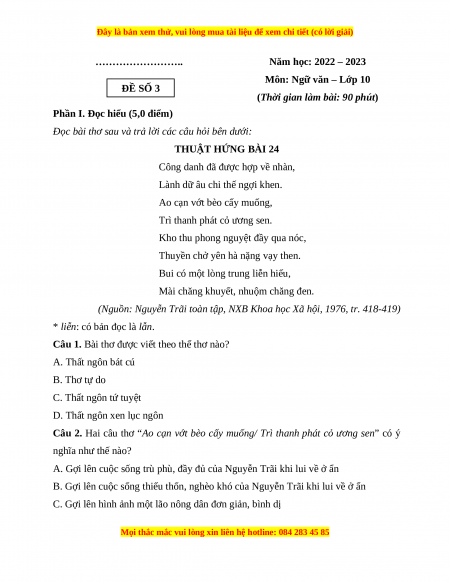 Môn: Ngữ văn – Lớp 10 ĐỀ SỐ 3