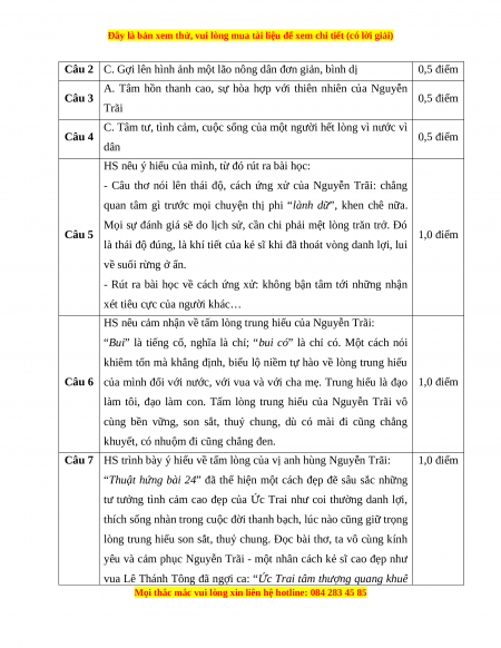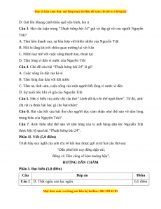 Câu 7 HS trình bày ý hiểu về tấm lòng của vị anh hùng Nguyễn Trãi: 1,0 điểm