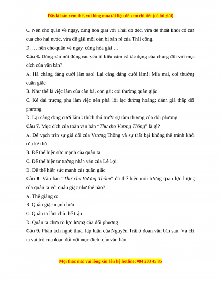 Câu 7. Mục đích của toàn văn bản “Thư cho Vương Thông” là gì?