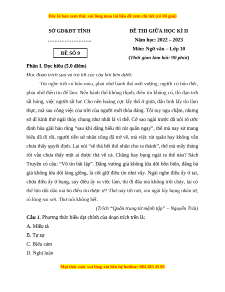 Môn: Ngữ văn – Lớp 10 ĐỀ SỐ 9