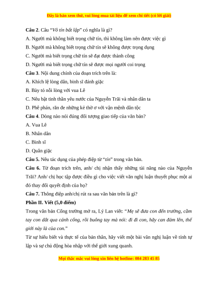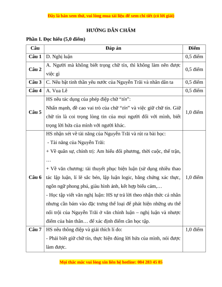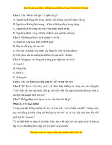 Câu 3 C. Nêu bật tinh thần yêu nước của Nguyễn Trãi và nhân dân ta 0,5 điểm Câu 4 A. Vua Lê 0,5 điểm